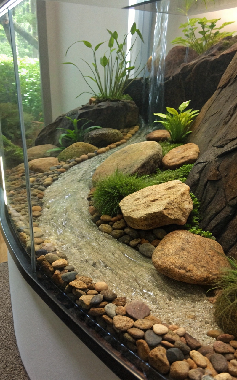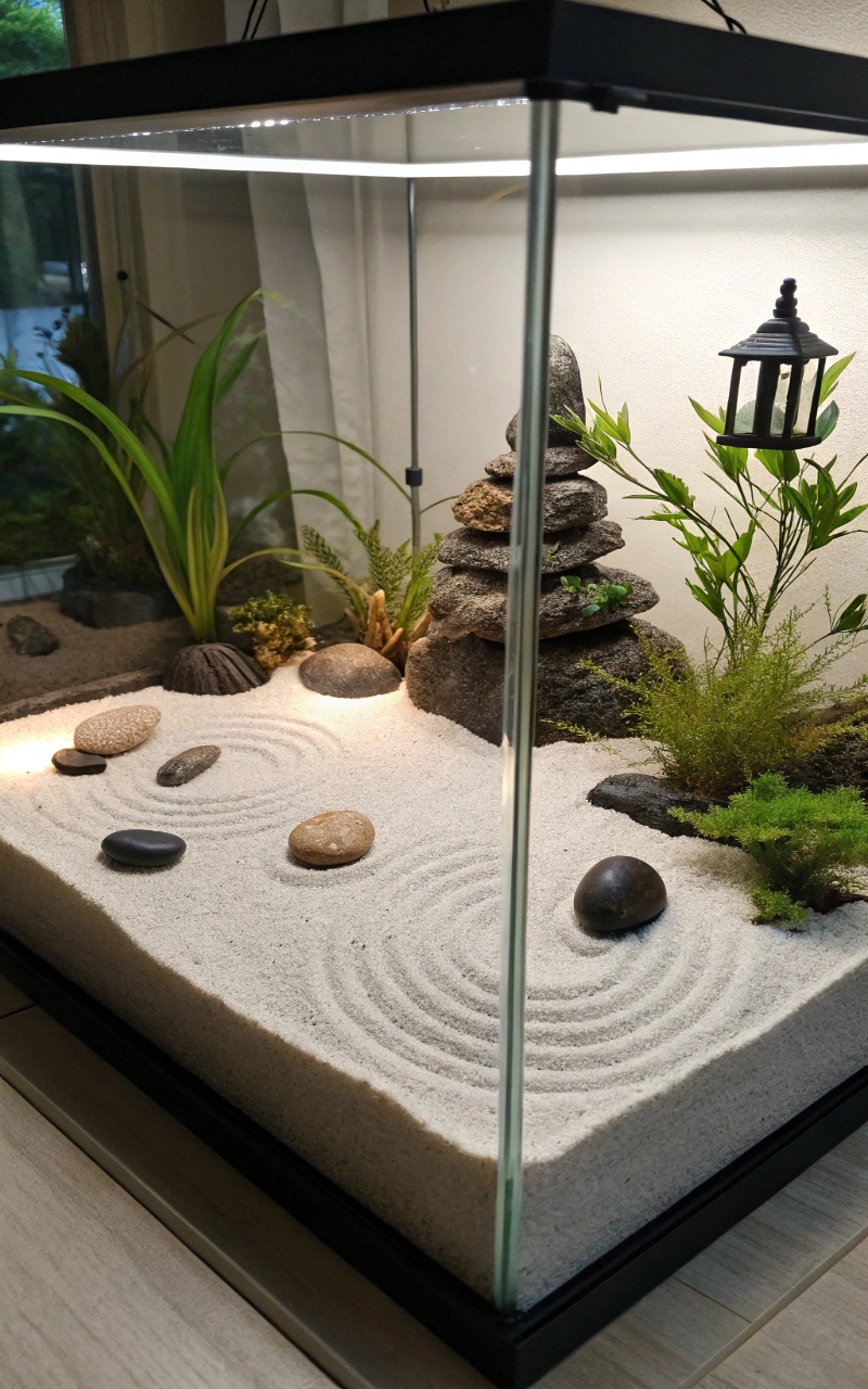 A zen-inspired tank focuses on balance, simplicity, and calm energy. I used smooth sand, a few carefully placed stones, and minimal plants, and it felt incredibly peaceful. It’s not busy, but that’s what makes it stand out. The design feels intentional and soothing.