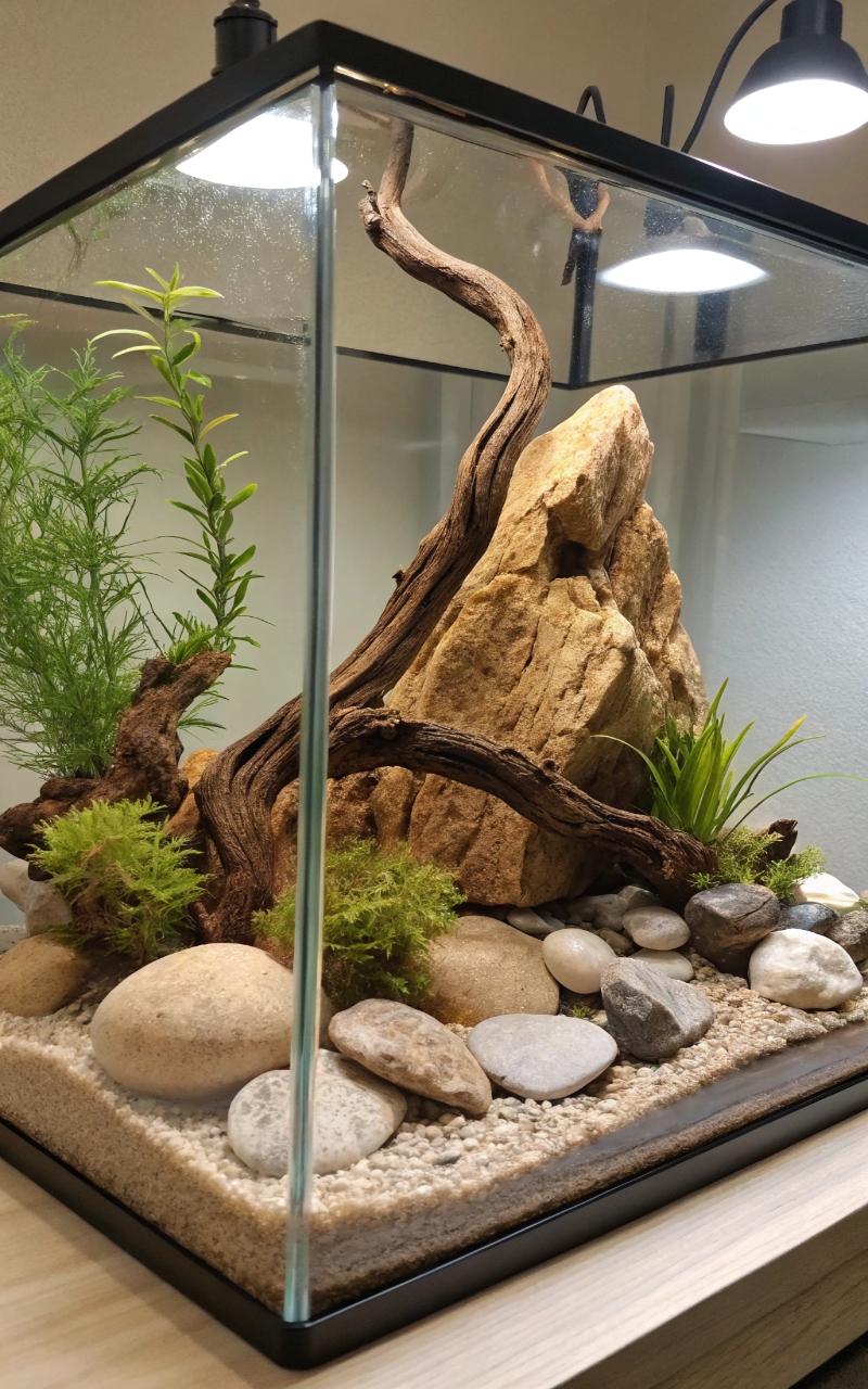 Combining driftwood with smooth stones creates a natural, grounded design that feels balanced and organic. I arranged the pieces to mimic a natural landscape, and it instantly made the tank feel more intentional. The textures play off each other beautifully under soft lighting. It’s simple, but it looks thoughtfully designed.