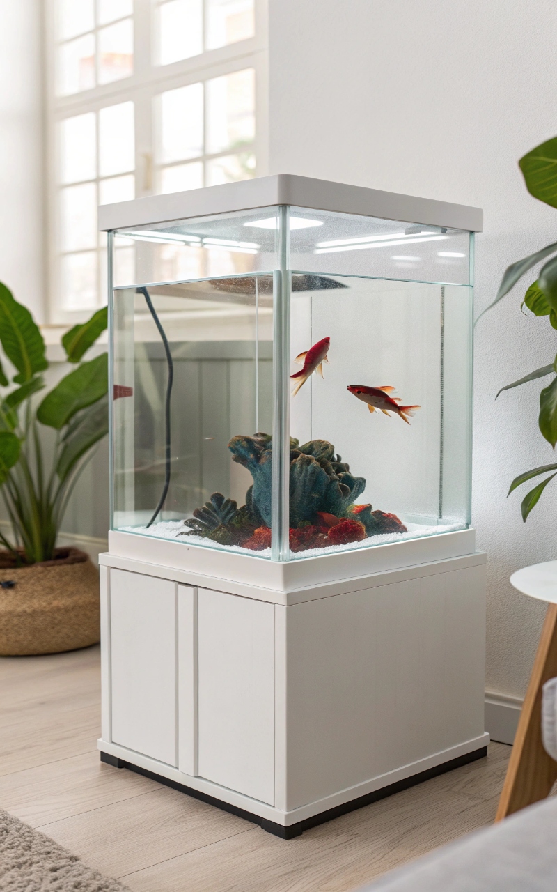 A white base paired with clear glass creates a bright, airy look that feels fresh and contemporary. I loved how the light reflected around the tank, making everything feel open and clean. It’s simple but very stylish.
