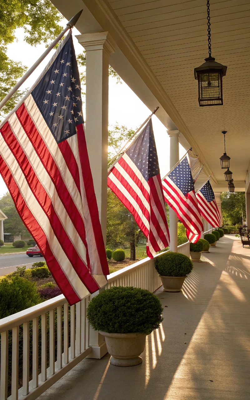 I placed a mix of large and small flags around the porch, and it instantly created that bold, classic patriotic look without needing much else. The movement of the flags in the breeze adds energy that makes the whole setup feel alive. It’s simple, but it sets the tone right away. The layering keeps it from looking flat or repetitive. Isn’t it amazing how something so traditional still feels so strong? Pro Tip: Combine standing flags with hanging ones for depth.