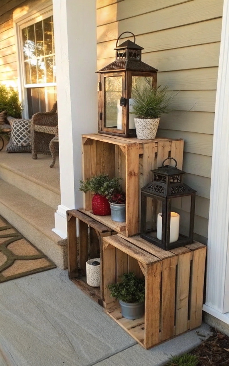 I stacked a few wooden crates and used them as display stands, and it added height and structure to the porch. The natural wood tones soften the bright colors, creating a more balanced look. It’s perfect for holding small decor pieces like lanterns or plants. The layered setup feels styled but relaxed. It’s simple, but it works beautifully. Pro Tip: Use crates of different heights for dimension.