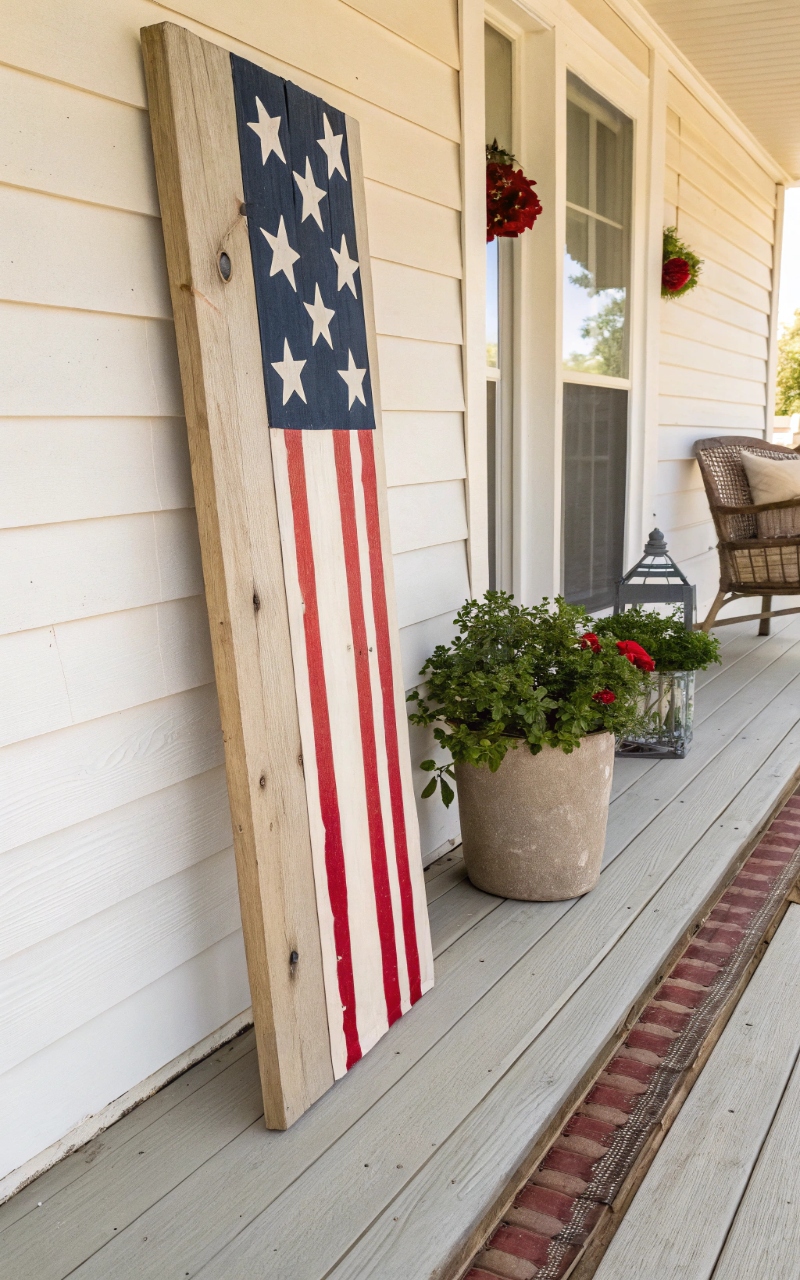 Hanging a red, white, and blue wreath on the front door instantly made the entrance feel festive and welcoming. It draws attention without needing extra decor around it. The circular shape adds a soft contrast to straight lines on the porch. It’s a small detail that makes a big difference. It sets the mood right away. Pro Tip: Mix fabric, greenery, and ribbon for texture.