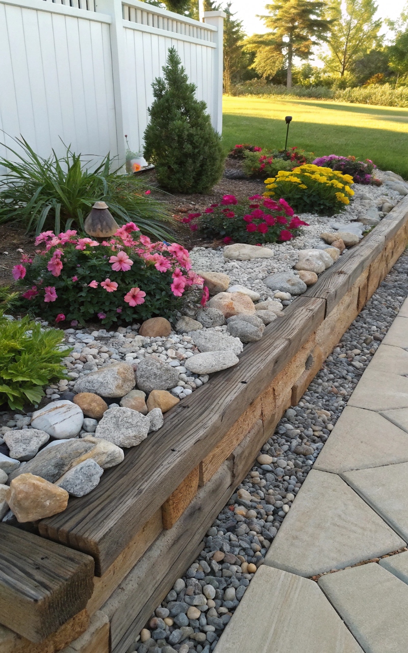 Combining different materials like stone, wood, and gravel created a unique border that feels layered and intentional. The mix adds texture and visual interest. It avoids a one-dimensional look. It’s creative and flexible. It feels personal and dynamic. Pro Tip: Keep a consistent color palette for cohesion.