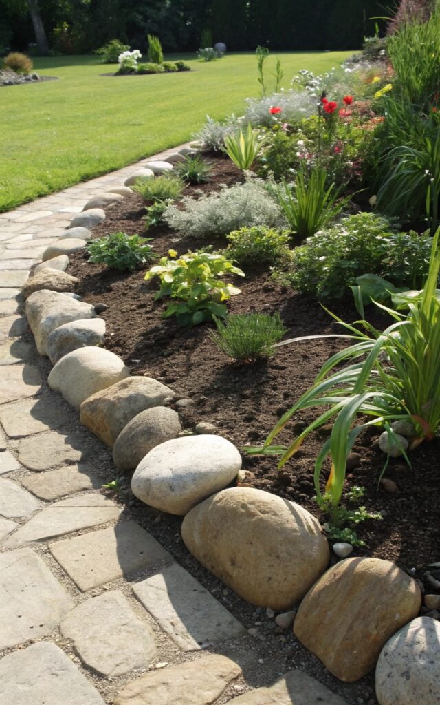 Using stones of different shapes and sizes created a border that feels organic and relaxed. The uneven edges give it a natural flow that blends seamlessly with plants. It doesn’t feel forced or overly designed. It’s like the garden shaped itself. It’s simple, but very effective. Pro Tip: Place larger stones first, then fill gaps with smaller ones.