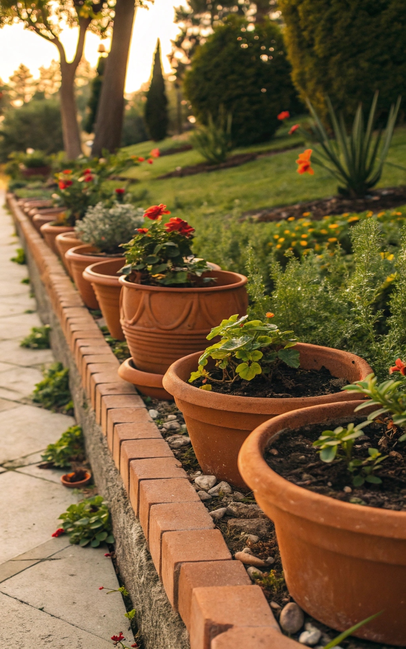 I placed small terracotta pots along the edge, and it created a warm, layered border full of character. Some pots held plants, while others added texture. The earthy tones blend beautifully with greenery. It’s decorative and functional. It’s such a charming detail. Pro Tip: Mix pot sizes for variety.
