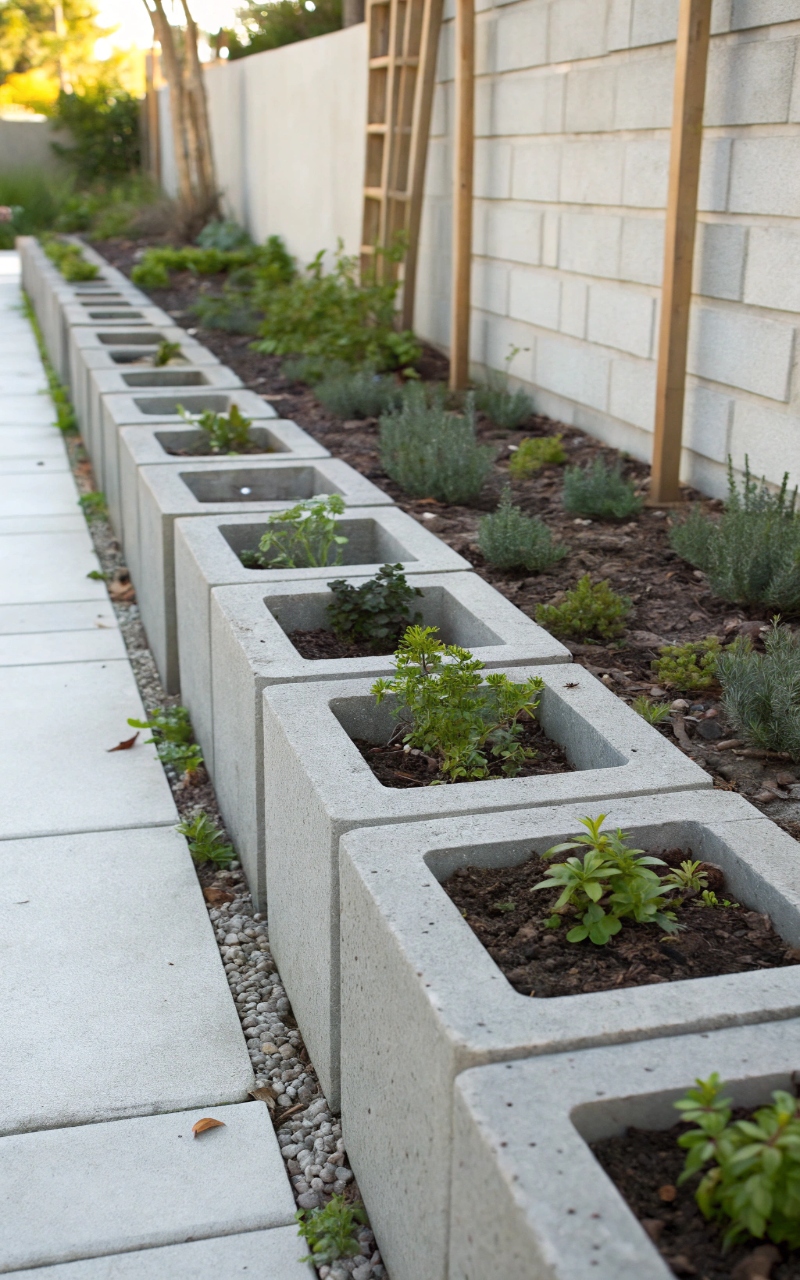 Using concrete blocks gave my garden a structured, modern look while also being very durable. The hollow centers can even hold small plants for added detail. It’s functional and decorative at the same time. The clean lines create a strong visual edge. It’s simple, but impactful. Pro Tip: Paint blocks for a customized finish.