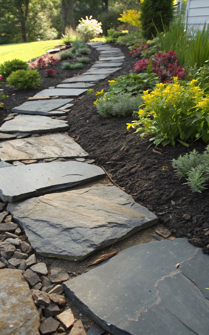 Using slate stones created a darker, more dramatic border that contrasts beautifully with bright plants. The flat surfaces give a clean, layered look. It feels slightly more refined while still natural. The texture adds depth. It’s bold, but balanced. Pro Tip: Overlap stones slightly for a layered effect.