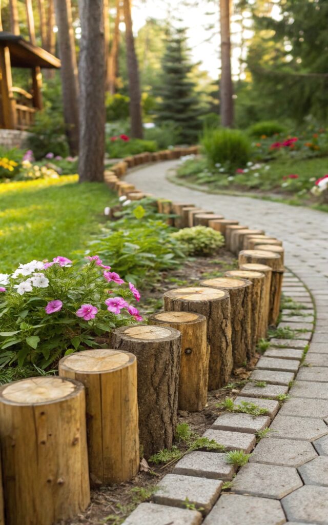 I used small logs to outline a flower bed, and it gave the space a warm, rustic feel that’s both cozy and natural. The wood texture adds depth without overpowering the plants. It’s perfect for a more relaxed garden style. The look feels grounded and inviting. It’s simple, but charming. Pro Tip: Treat wood to prevent rot.