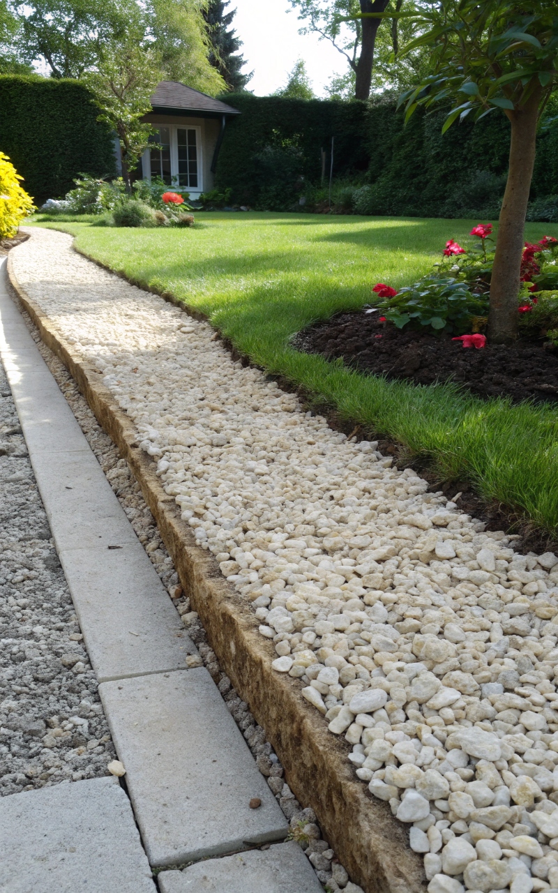 I dug a shallow trench and filled it with gravel, and it created a clean separation between lawn and flower bed. The texture adds contrast while also helping with drainage. It’s low-maintenance and visually neat. The edge feels defined without being heavy. It’s simple, but practical. Pro Tip: Use landscape fabric underneath to prevent weeds.