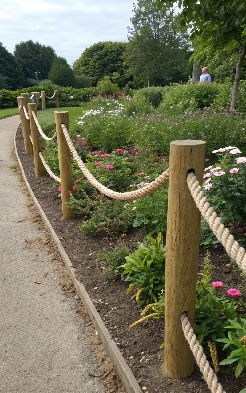 A rope border with small stakes created a soft, casual edge that feels relaxed and different from traditional borders. The rope adds texture without being too bold. It’s perfect for informal garden styles. The look feels light and open. It’s simple, but effective. Pro Tip: Use weather-resistant rope.