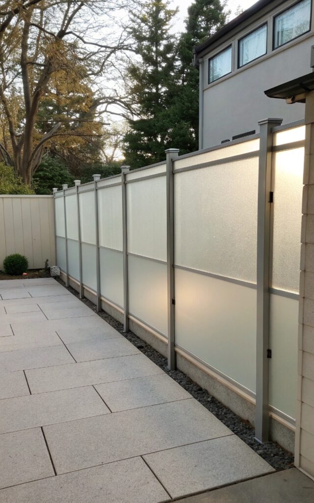 Frosted glass panels provide privacy without blocking light, which keeps the garden feeling bright and open. The smooth surface adds a modern touch, and the diffused light creates a soft, calming atmosphere. It’s sleek and subtle at the same time. The effect feels clean and minimal. It’s privacy without heaviness. Pro Tip: Use tempered glass for safety and durability.