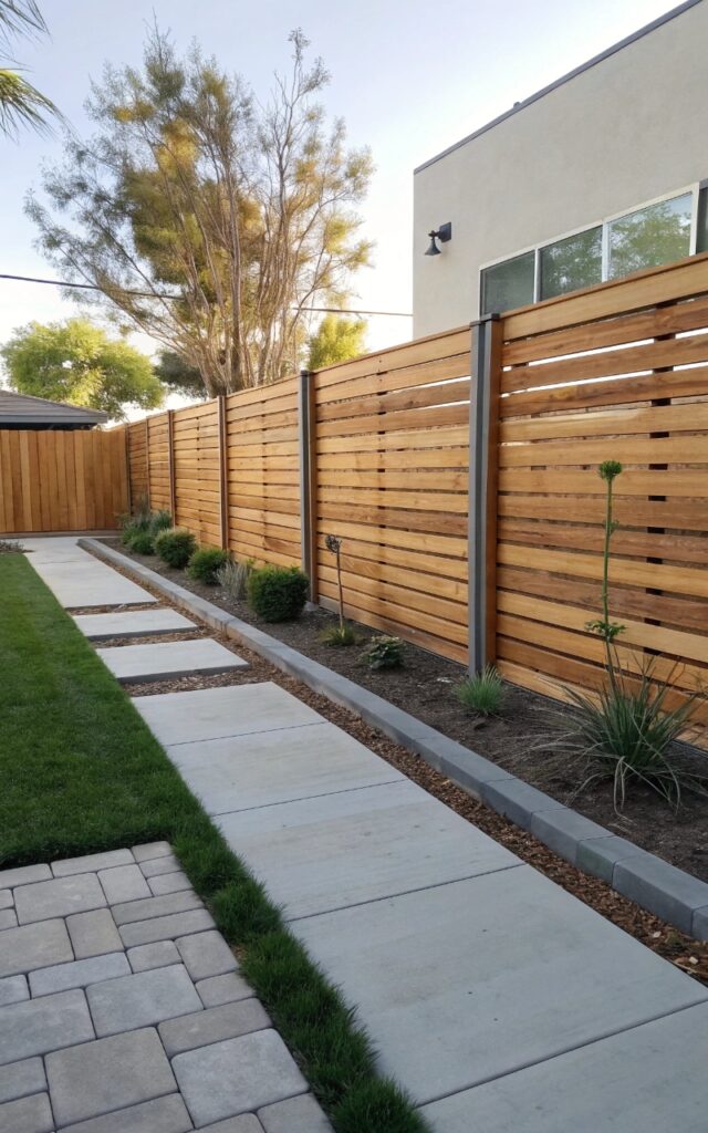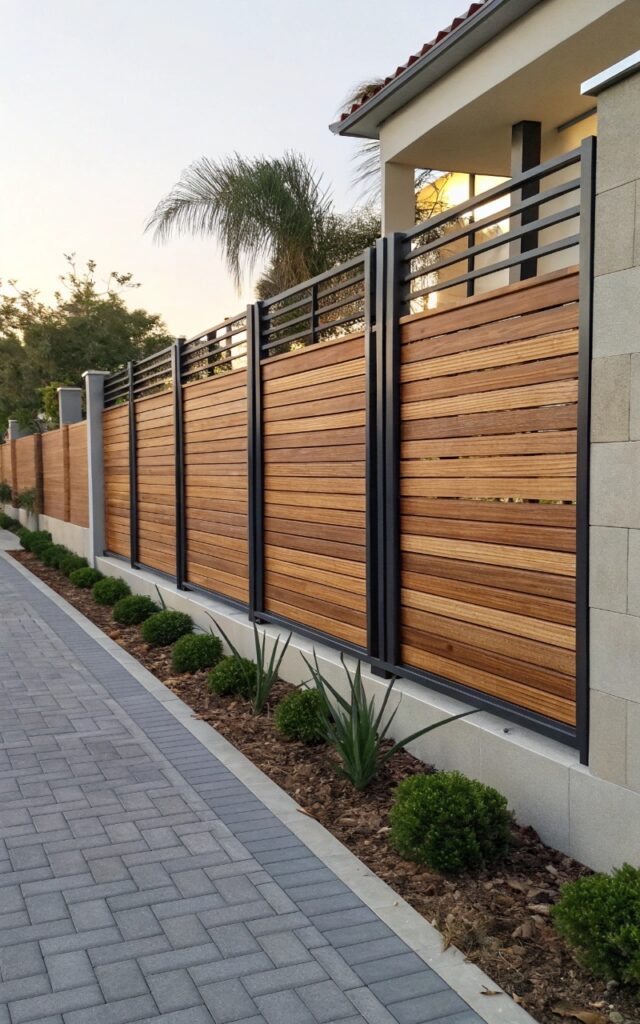 Combining wood and metal creates a balanced design that feels both warm and modern. The contrast between materials adds visual interest while maintaining strong privacy. It’s a great way to avoid a flat, one-dimensional look. The mix feels intentional and unique. It’s design and function together. Pro Tip: Keep a consistent color palette for cohesion.