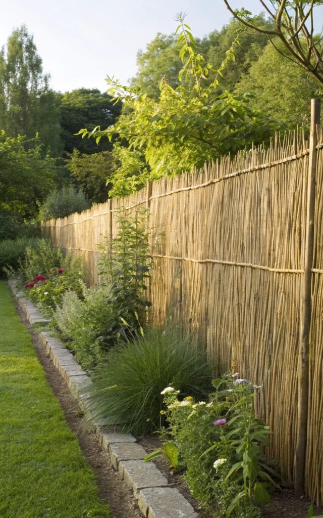 Natural reed or willow fencing adds a soft, organic look that blends easily with garden surroundings. It provides decent privacy while keeping the space feeling relaxed and natural. The texture brings warmth without overwhelming the design. It’s simple, but very charming. It’s one of those understated options that works quietly. Pro Tip: Secure tightly to prevent movement in wind.