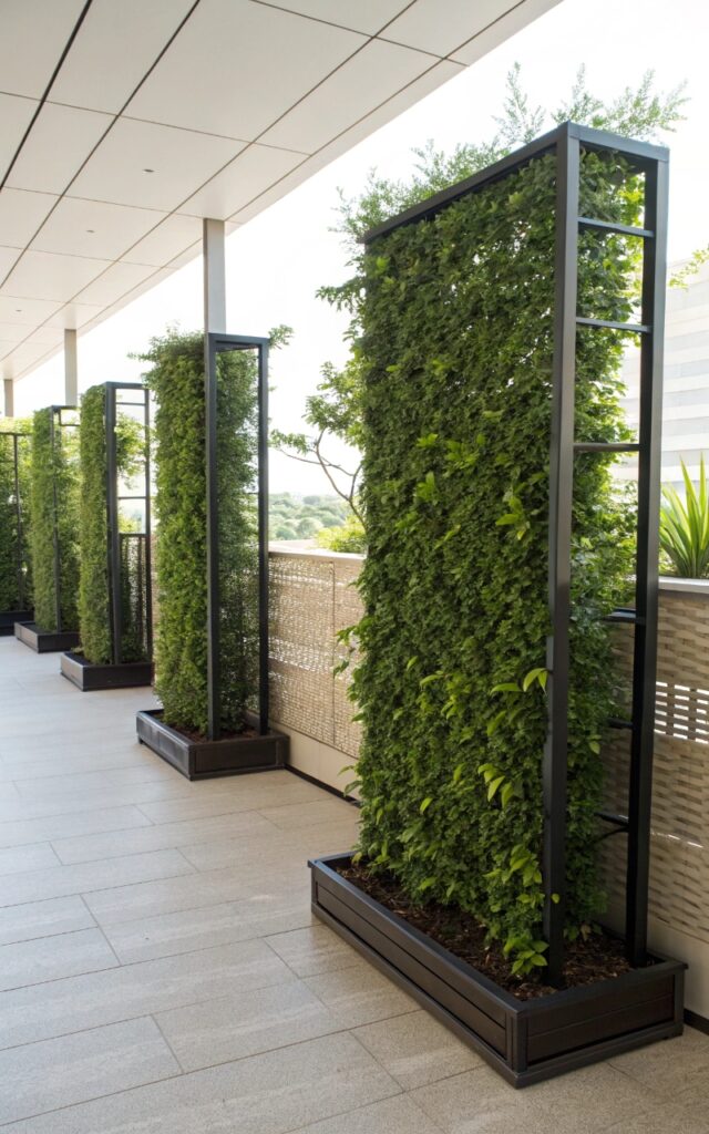 Freestanding vertical screens with plants create flexible privacy that you can adjust as needed. They’re perfect for smaller spaces or areas where you don’t want a permanent fence. The greenery softens the structure while still blocking views. It feels light but effective. It’s privacy you can move around. Pro Tip: Use sturdy bases to keep screens stable.