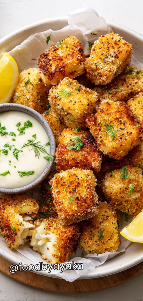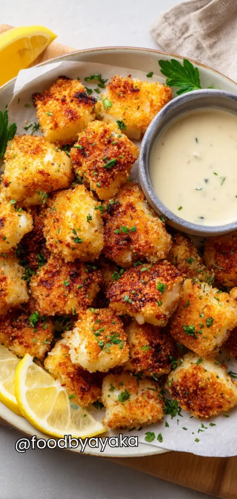 Serve immediately: Transfer the hot fish bites to a serving plate. Serve with your favorite dipping sauces like tartar sauce, spicy mayo, or lemon aioli. Garnish with lemon wedges or fresh herbs for a bright, fresh touch. These bites are perfect for parties, snacks, or a quick family dinner, and the air fryer makes them much healthier than deep frying while still keeping them satisfyingly crispy.