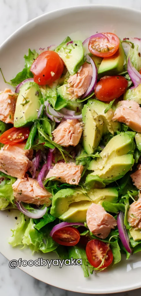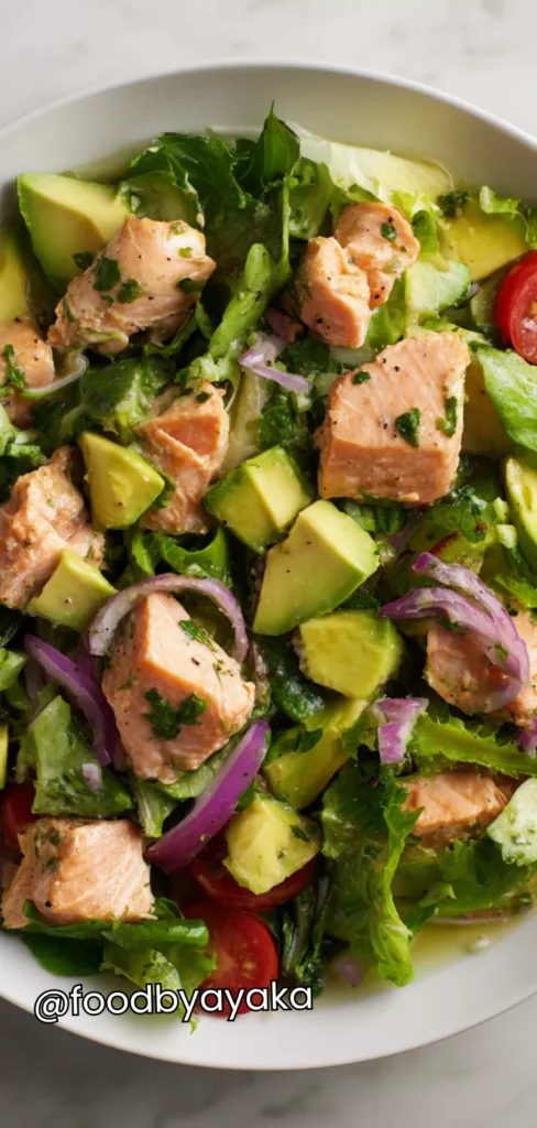 I have always loved experimenting with salads in my kitchen. I use ripe, buttery avocados, fresh salmon fillets, and crisp mixed greens. Always make sure your salmon is cooked just right—not dry, not overdone—and the avocado is perfectly ripe so it blends seamlessly with the other ingredients.