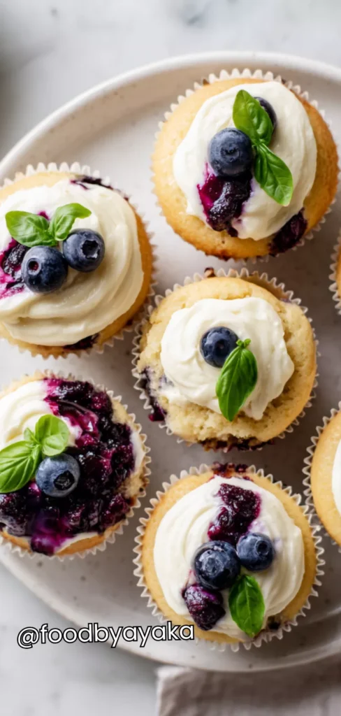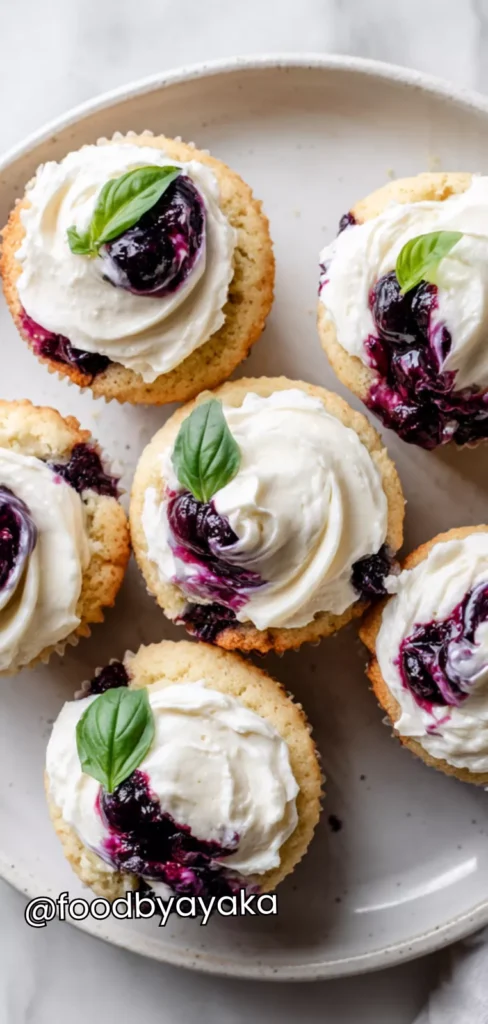 I love serving these cupcakes at brunch because they feel both elegant and playful. I usually arrange them on a cake stand or pretty plate so the blueberries peek through the top. The little basil leaves on top make them look like a homemade gourmet treat. I often add a small drizzle of powdered sugar or a light glaze for extra visual appeal, which makes them look festive and inviting.