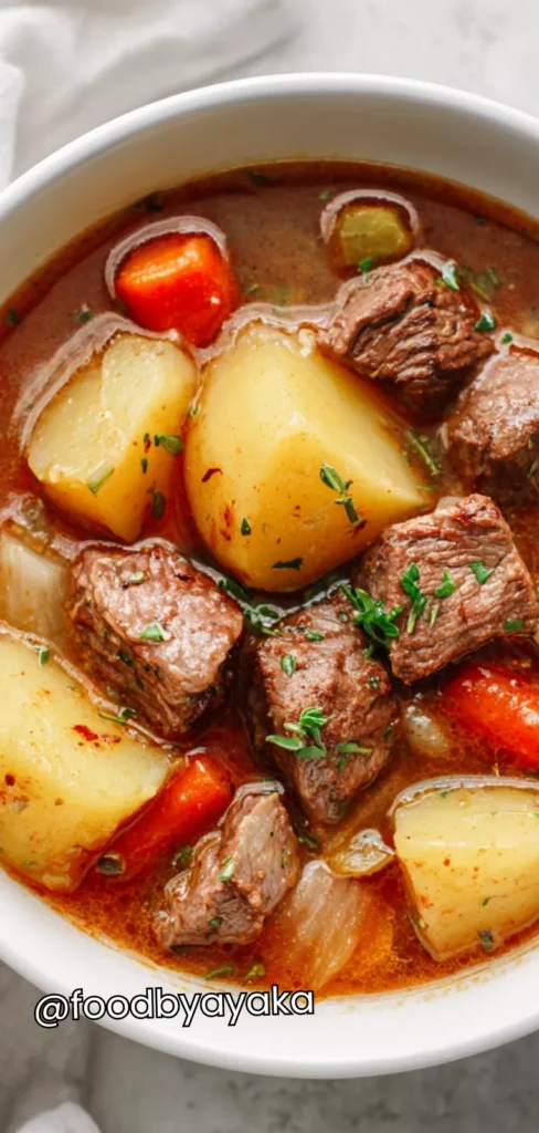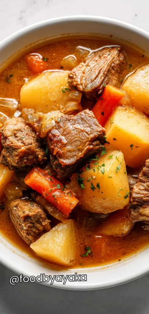 Beef and Potato Stew can be a healthy and balanced meal when made at home because it contains protein, vegetables, and natural carbohydrates that keep you full and satisfied. The broth helps with hydration, and the slow cooking keeps the nutrients and flavors intact.