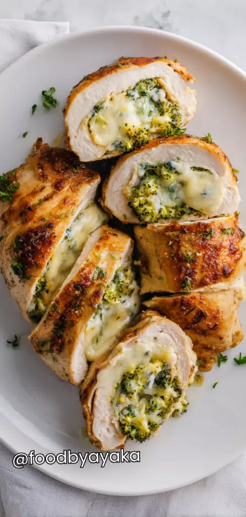 Serve: Remove the toothpicks if used and let the chicken rest for a few minutes before serving. This helps keep the juices inside. Slice carefully to reveal the creamy broccoli and cheese filling, and serve warm for the best flavor and texture.