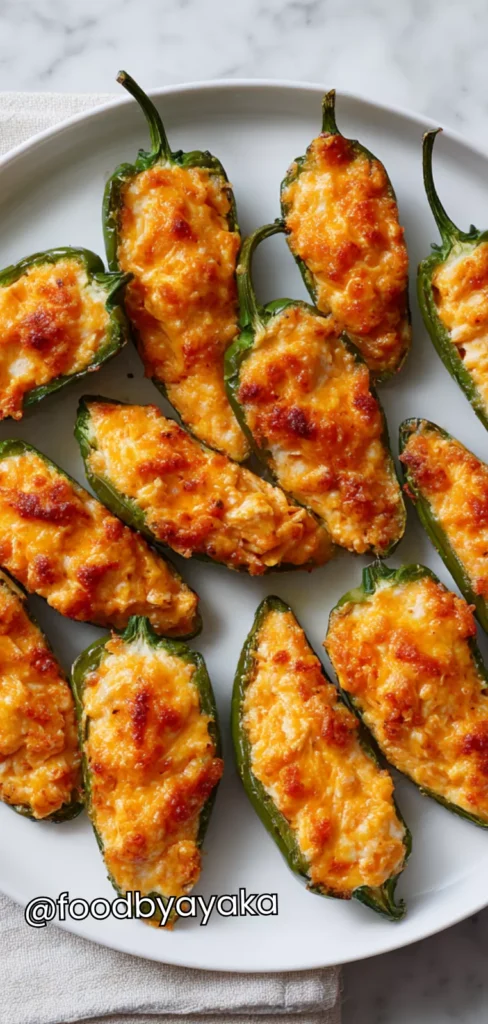 Bake the poppers: Preheat the oven to 400°F (200°C). Bake the stuffed jalapeños for 20–25 minutes, or until the jalapeños are tender and the tops are golden brown. Check halfway through and rotate the pan for even cooking.
