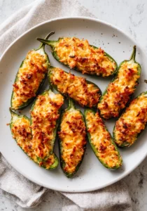 - Add the topping: In a small bowl, mix panko breadcrumbs with melted butter until coated. Sprinkle the breadcrumb mixture evenly over the stuffed jalapeños for a golden, crispy topping once baked.