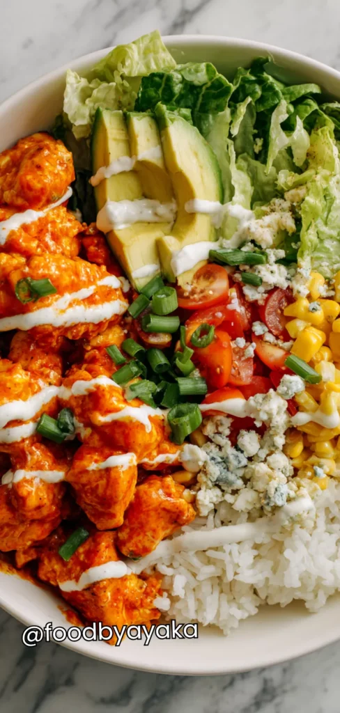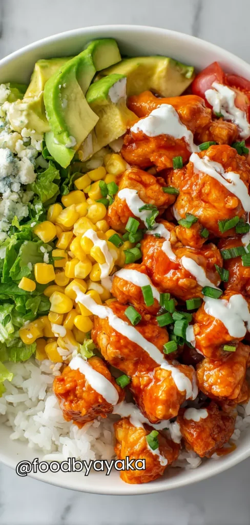Making these bowls is super fun, but getting the perfect balance of spice and creaminess in every bite is a little tricky. You want the chicken coated evenly, the rice soft but not mushy, and the toppings fresh and crunchy. When all of these elements come together, the result is a bowl that’s spicy, tangy, and so satisfying that everyone at the table will go back for seconds. If you love bold flavors, creamy textures, and a little kick in your meals, this Buffalo Chicken Ranch Rice Bowl is an absolute winner. Imagine tender, juicy pieces of chicken tossed in spicy buffalo sauce, layered over soft, fluffy rice, and topped with crisp vegetables, shredded cheese, and a generous drizzle of ranch dressing.