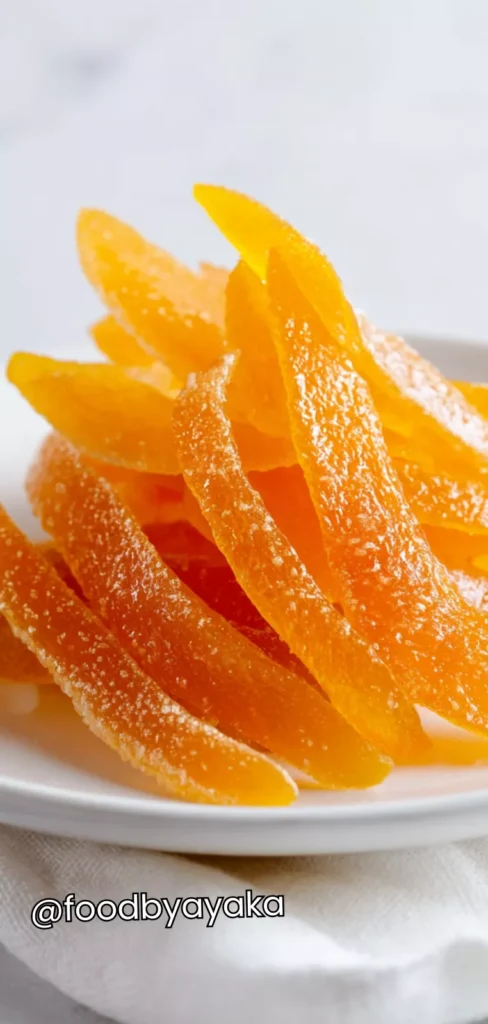 I sometimes dip half of each peel in melted dark chocolate and arrange them on a plate when I have guests. I feel this version looks elegant and special without much effort. It is perfect for dessert tables, parties, or homemade gifts.