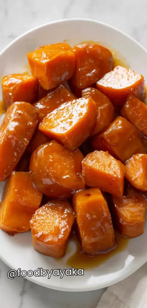 Serve: Let the candied sweet potatoes cool slightly before serving so the syrup thickens a bit more. Spoon extra glaze over the top when plating. Serve warm as a comforting side dish, perfect for holidays or family meals.