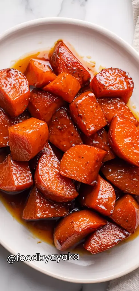 I like to serve candied sweet potatoes warm, right after they come out of the oven, when the glaze is still thick, shiny, and coating every slice beautifully. Serving them at this stage really brings out the deep caramel flavor and makes the dish feel extra comforting and fresh.