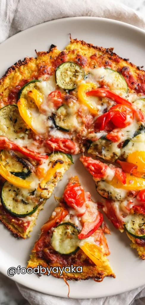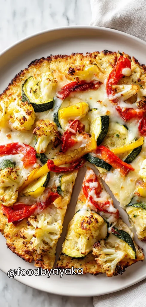 My mother always loved traditional homemade pizza, but in our home it is important to keep meals balanced and not too heavy. She taught me that food can be both comforting and nourishing at the same time. Making this Cauliflower Crust Pizza with Veggies is one of my favorite ways to enjoy pizza without feeling heavy afterward. It has a golden, slightly crispy crust made from cauliflower, topped with colorful vegetables and melted cheese.