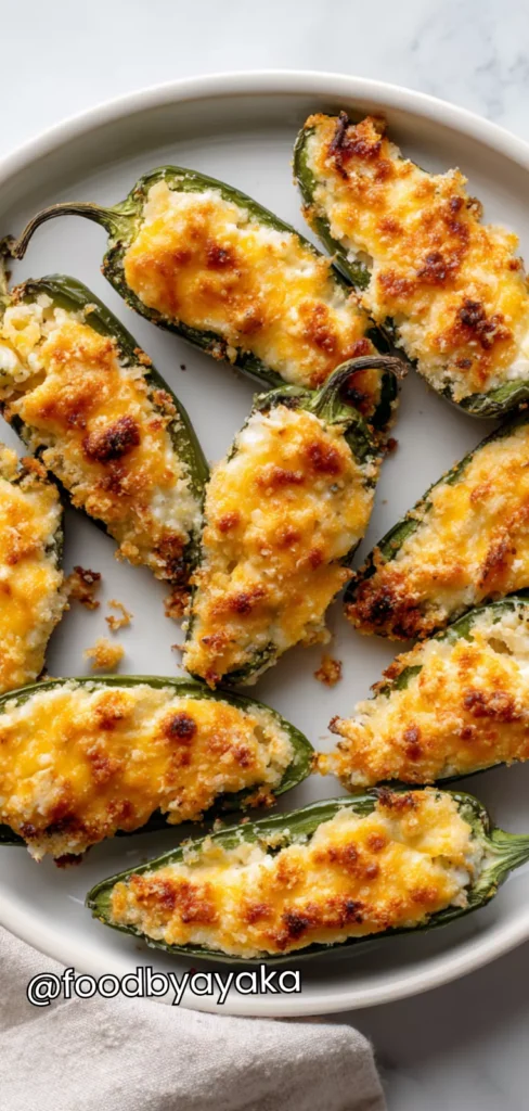 I love how simple ingredients can turn into something so flavorful and comforting. The combination of sharp cheddar and smooth cream cheese balances the natural heat of the jalapeños, creating that perfect bite — spicy but not overwhelming. This recipe is easy to prepare and doesn’t require fancy techniques. You just cut, mix, fill, and bake. Yet the result feels special enough for parties, holidays, or even weekend family movie nights. The golden melted cheese on top and the tender baked peppers make them irresistible.