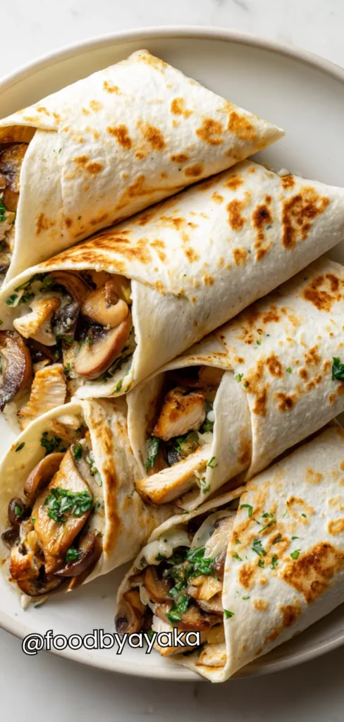 I usually serve these wraps immediately after assembling because warm chicken and melted cheese taste the best. I like to arrange them neatly on a large plate, slicing each wrap diagonally to make them look elegant and inviting. I often add a few extra fresh mushroom slices or a small sprinkle of shredded cheese on top for color and visual appeal.