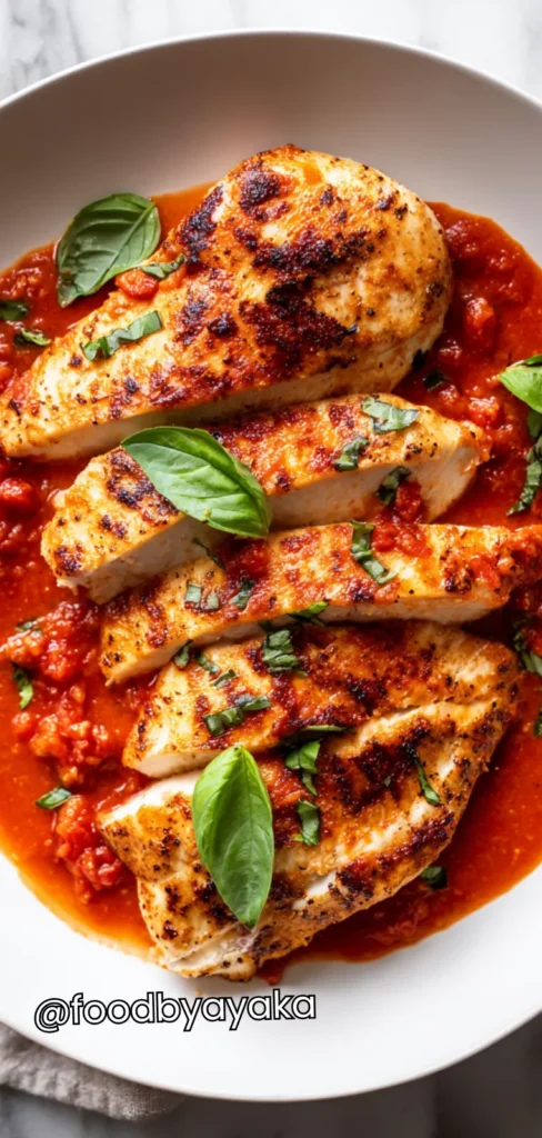 I usually serve Chicken Breast with Tomato Sauce straight from the pan because it keeps the chicken warm and juicy, and I love spooning plenty of tomato sauce over the top so every bite feels rich and comforting. I often add a small sprinkle of fresh herbs at the end because it makes the dish feel fresh and complete without extra effort.