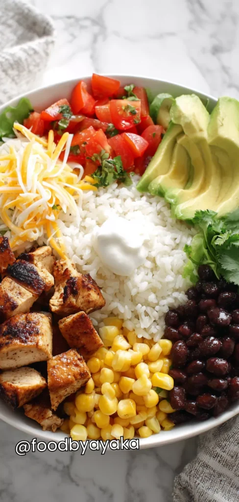 - Assemble the Burrito Bowls: In each serving bowl, start with a generous layer of rice. Add a scoop of black beans and a spoonful of corn. Arrange sliced chicken on top, followed by diced tomatoes, red onion, avocado, and cheese. Sprinkle with fresh cilantro for color and flavor.