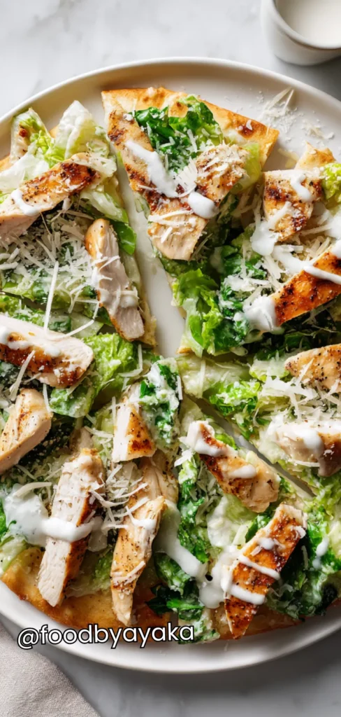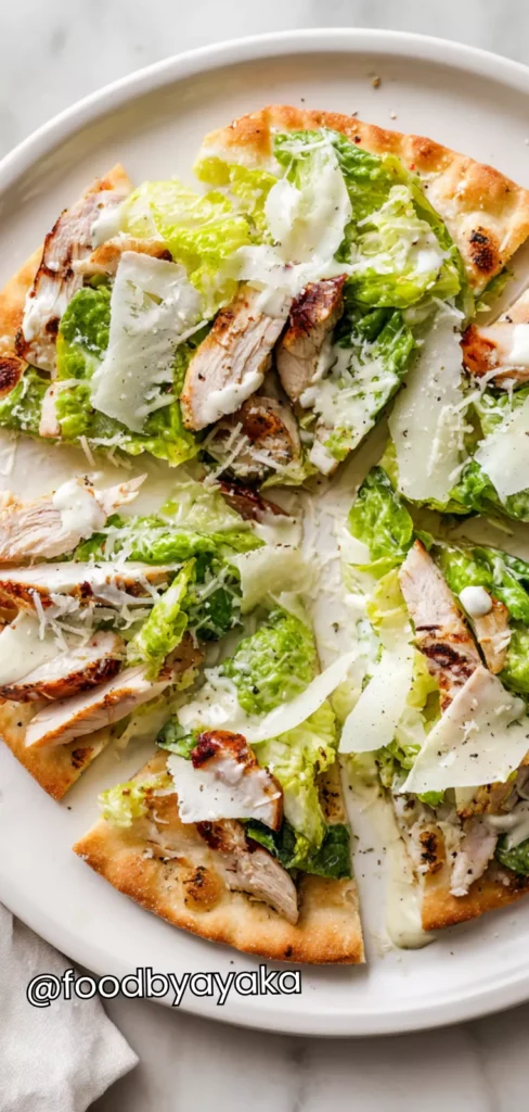 Last month, I tried making this for a small family gathering, but the flatbread in the grocery store didn’t hold up well to the toppings. Chicken Caesar Flatbread is a quick, easy, and delicious dish that combines the crispiness of flatbread with savory chicken, fresh lettuce, and creamy Caesar dressing. It’s perfect for a lunch, a light dinner, or even a fun weekend snack. The flatbread acts as the base, while the toppings bring layers of flavor and texture. Every bite gives you the crunch of lettuce, the tang of Caesar, the savory taste of chicken, and the subtle sharpness of Parmesan cheese.