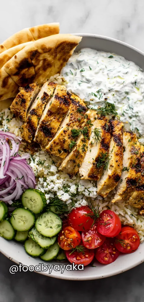- Vegan Bowl: Use grilled tofu or tempeh instead of chicken. Marinate with olive oil, garlic, and oregano. Serve with vegan tzatziki. Add extra veggies for heartiness.