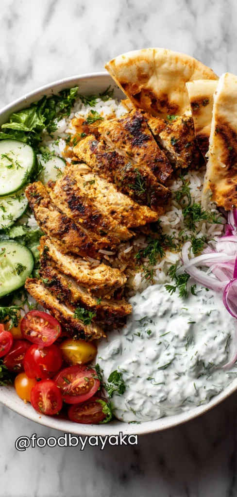 - Beef or Lamb Gyro Bowl: Swap chicken with thinly sliced beef or lamb. Marinate in the same herbs and lemon juice. Cook until browned. Top with tzatziki and pita.
