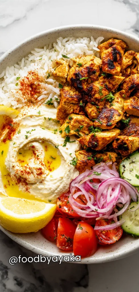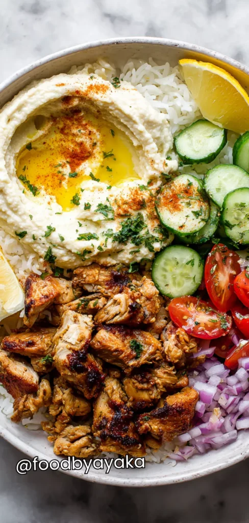 minutesMake this easy Chicken Shawarma Bowl with Rice and Hummus — juicy marinated chicken, creamy hummus, and fresh vegetables for a complete Middle Eastern-inspired meal. Perfect for meal prep or family dinners!