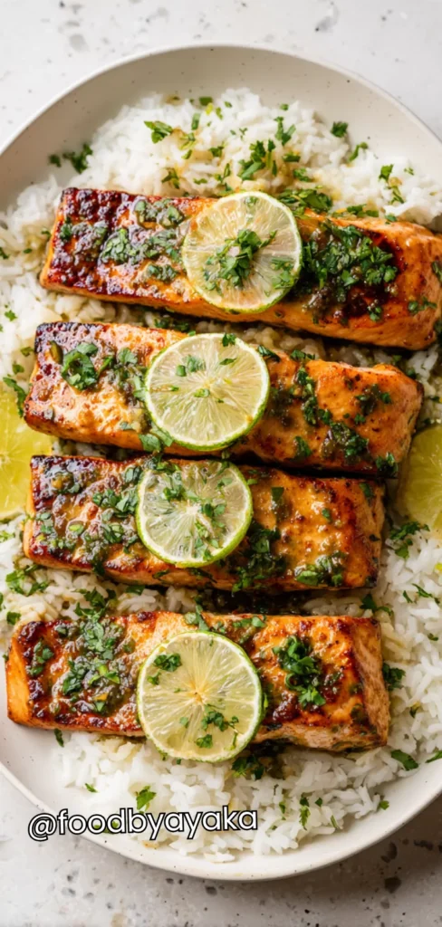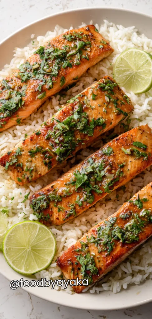- Assemble the dish: Serve salmon fillets on a bed of fluffy rice. Drizzle the remaining cilantro-lime mixture over the top. Garnish with extra cilantro and lime wedges for a bright, fresh finish.