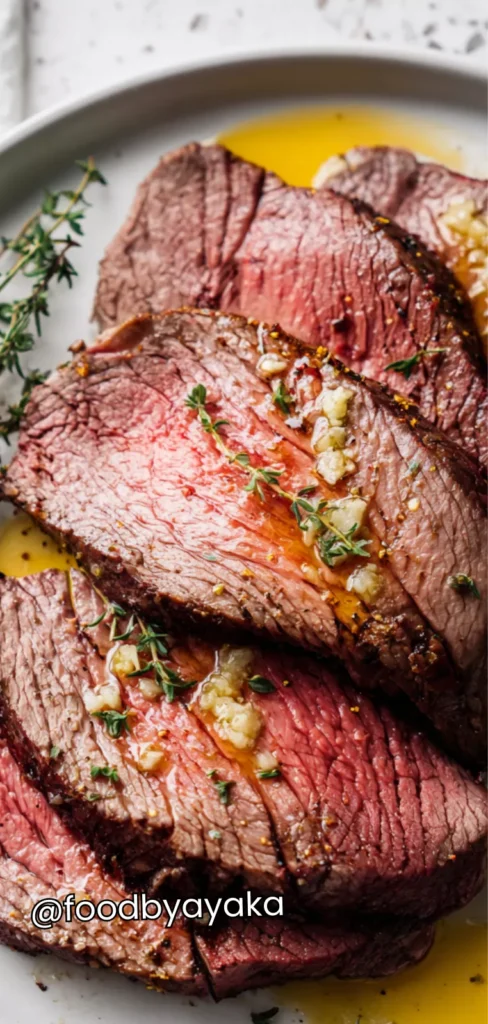- Slice and serve: Carve the roast against the grain into thin slices. Arrange on a serving platter and spoon a little of the garlic butter drippings or gravy on top for extra flavor and shine.