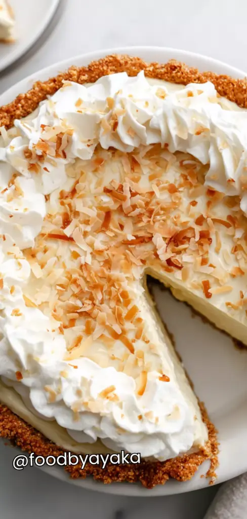 - Assemble and serve: Once the pie is fully chilled and set, remove it from the refrigerator and discard the plastic wrap. Spread or pipe the whipped cream evenly over the top, creating soft swirls or peaks for a decorative look. Sprinkle toasted coconut generously over the whipped cream for added texture and flavor. Slice and serve chilled for the best taste and consistency.