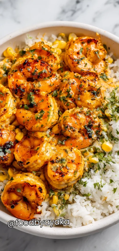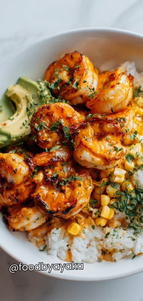 Assemble the rice bowls: Divide the cooked rice into bowls. Top with the creamy chipotle shrimp and drizzle any extra sauce from the pan over the top. Add optional toppings like avocado slices, corn, diced tomatoes, or shredded cheese for added texture and color.