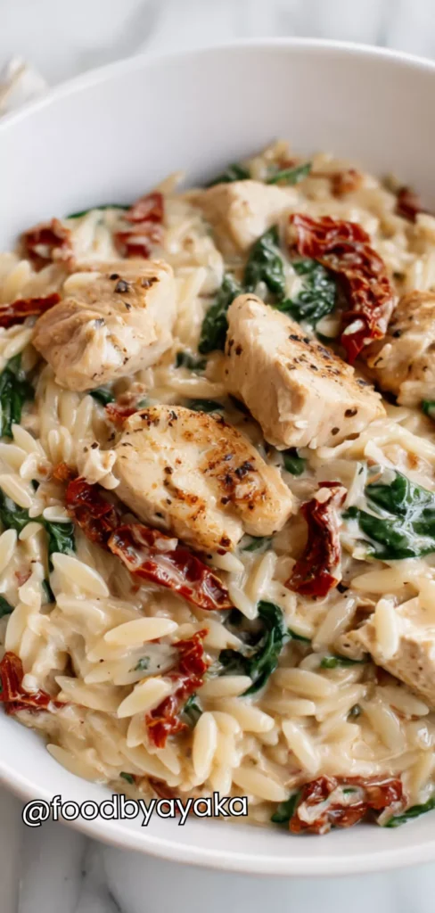 Creamy Tuscan Chicken Orzo is one of those comforting meals that feels fancy but is actually very simple to make. It combines tender chicken, soft orzo pasta, sun-dried tomatoes, fresh spinach, and a rich creamy sauce flavored with garlic and Parmesan. The result is a one-pan dish that is cozy, creamy, and full of flavor in every bite.