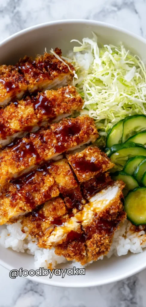 Assemble the bowl: Scoop warm rice into each bowl. Slice the crispy chicken into strips and place them neatly on top of the rice. Drizzle generously with the katsu sauce. Sprinkle green onions, sesame seeds, or a bit of shredded cabbage for crunch and freshness.