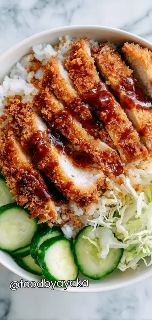 - Assemble the bowl: Scoop warm rice into each bowl. Slice the crispy chicken into strips and place them neatly on top of the rice. Drizzle generously with the katsu sauce. Sprinkle green onions, sesame seeds, or a bit of shredded cabbage for crunch and freshness.