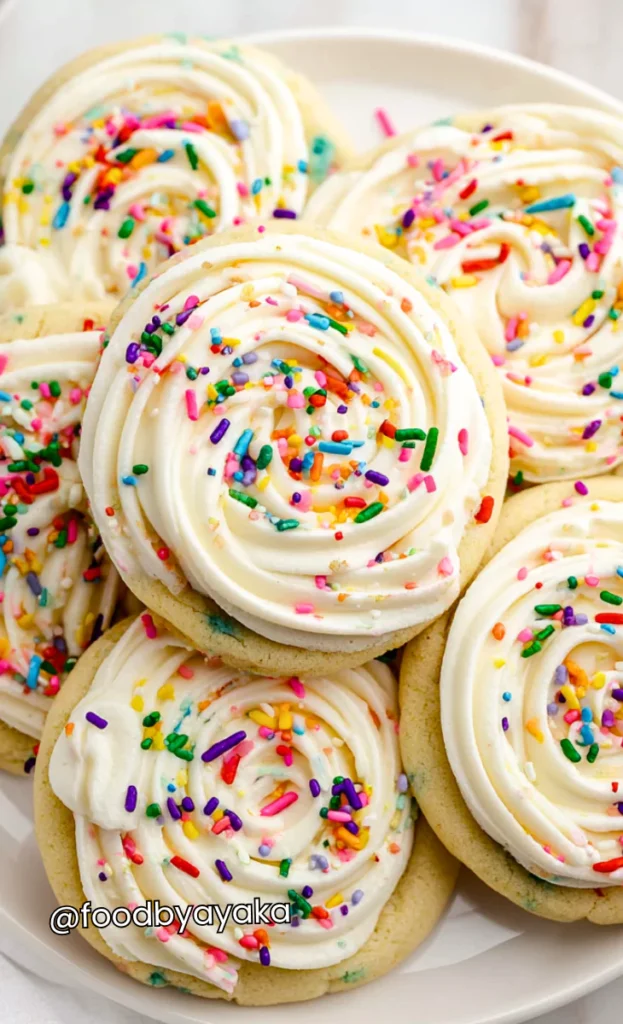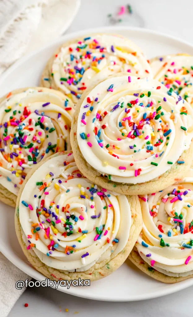 - Decorate: Pipe a thick swirl of frosting onto each cooled cookie. Finish with extra sprinkles on top. Serve fresh and enjoy!