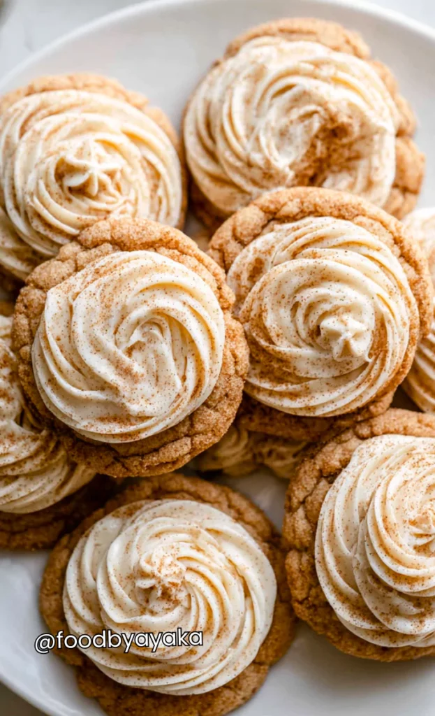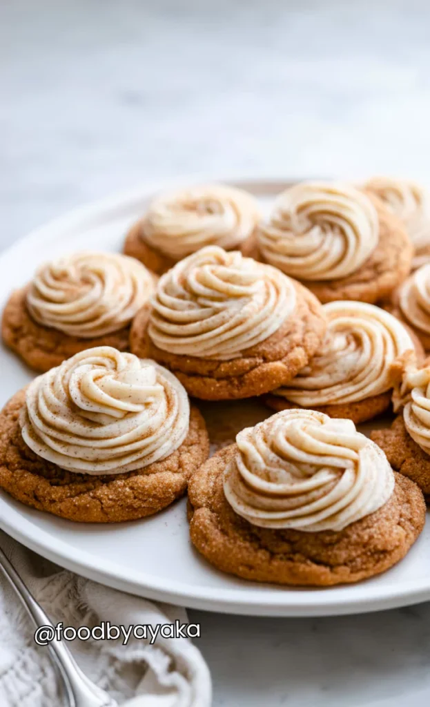 - Frost cookies: Once completely cooled, spread or pipe frosting on each cookie. Dust with extra cinnamon sugar if desired.
