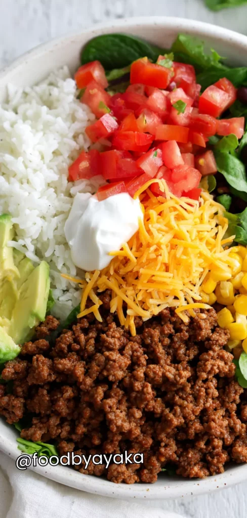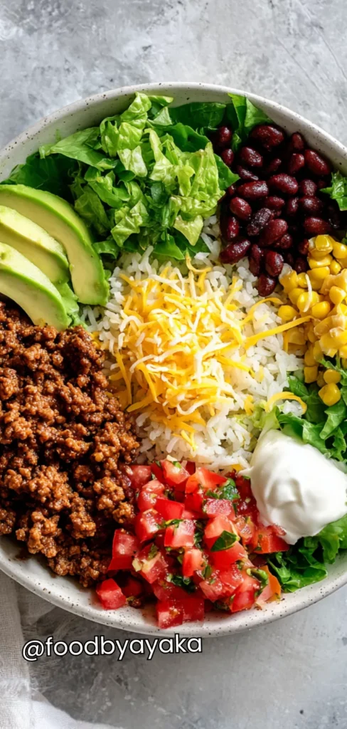 I love how you can layer rice, seasoned beef, beans, corn, fresh vegetables, and cheese into one bowl. Each bite is satisfying, and the flavors balance perfectly between savory, slightly spicy, and fresh.