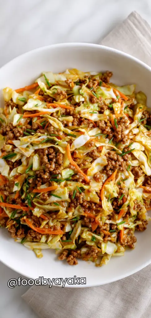 I have made this recipe so many times, especially on weeknights when I don’t feel like cooking something complicated. I use ground pork most of the time, but chicken or turkey works just as well. I always keep a bag of coleslaw mix in my fridge because it makes everything faster, and I don’t have to chop cabbage myself.