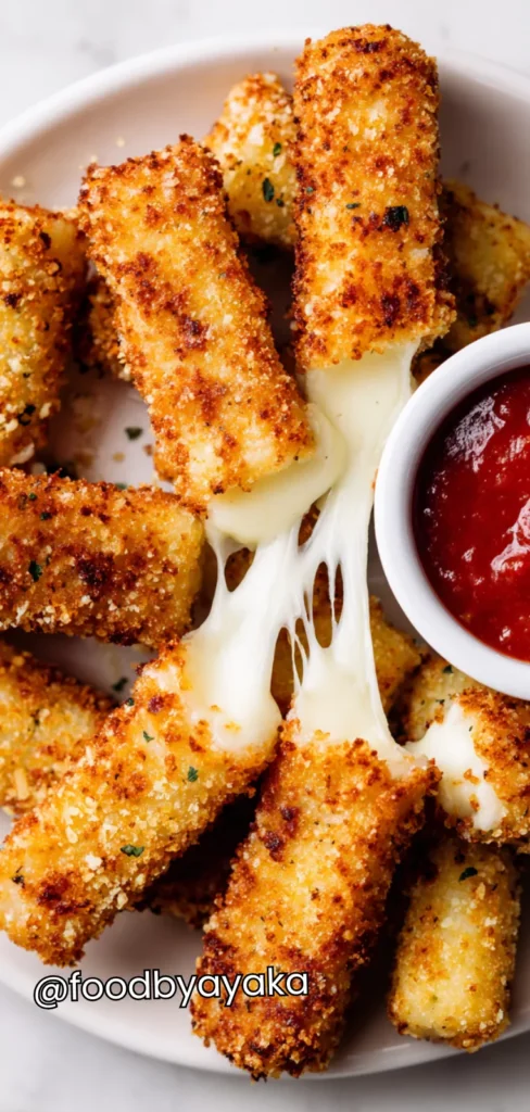 Serve and enjoy: Let the mozzarella sticks rest for 1–2 minutes so they’re hot but not scalding. Serve on a platter with warm marinara sauce, ranch dressing, or your favorite dipping sauce. For extra flair, sprinkle with chopped fresh parsley or a little grated Parmesan.